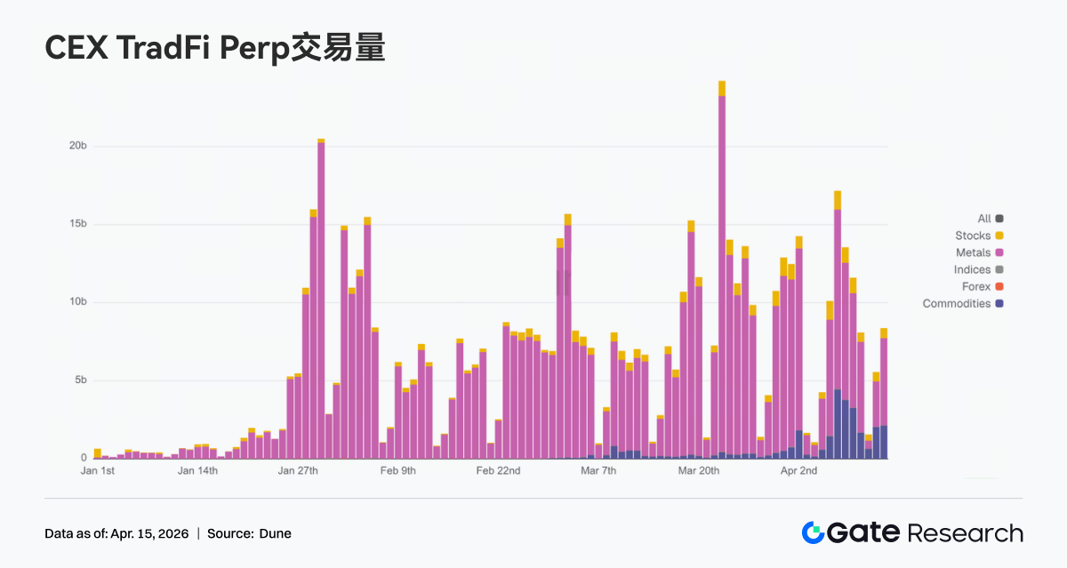 CEX TradFi 永续合约交易量整体维持在高位区间震荡,并呈现出“结构集中 + 波动放大”的特征。具体来看,交易量仍以金属类资产为绝对主导,尤其是黄金相关品种在宏观不确定性与通胀预期反复的背景下持续吸引资金参与,成为主要成交来源;与此同时,商品类尤其能源在周内亦出现阶段性放量,反映出市场对原油及宏观事件的交易需求上升。节奏上,周中交易量明显放大,对应宏观数据与地缘事件催化,随后虽有回落,但整体仍高于前期中枢,显示资金活跃度维持高位。结构上看,TradFi 交易正从单一避险资产驱动,逐步扩展至“黄金 + 原油 + 指数”的多资产联动框架,体现出用户从配置型交易转向以宏观波动为核心的策略交易。