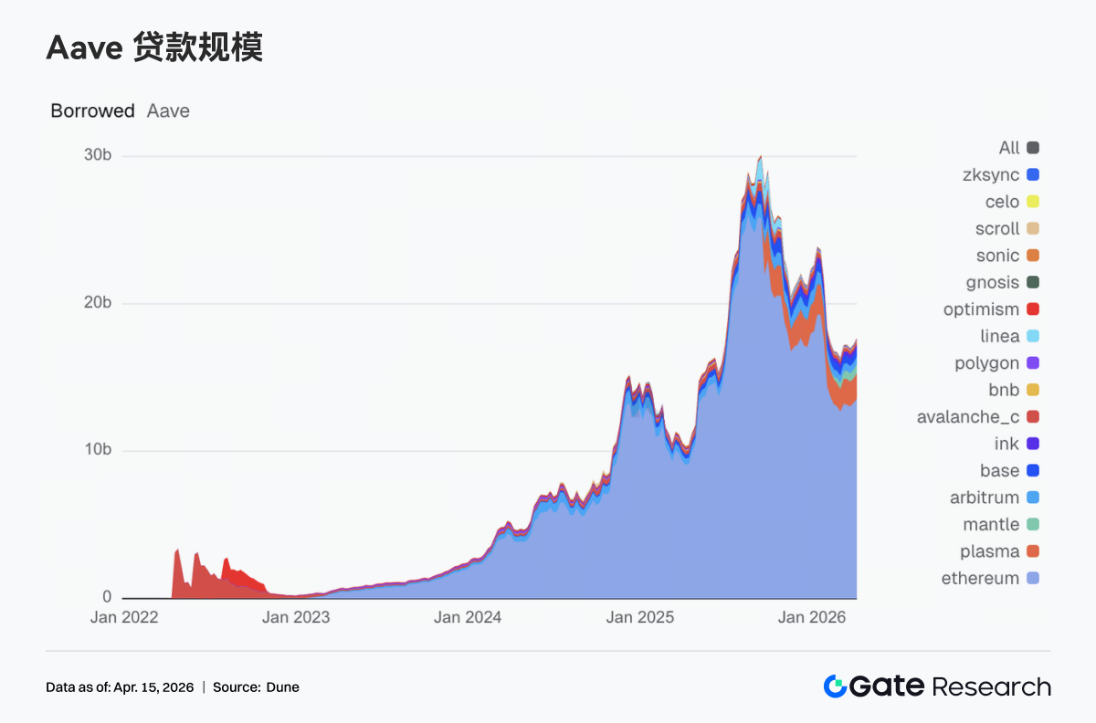 Aave 借贷规模升至约 176.9 亿美元,高于前一周的 172.5 亿美元。其中,Ethereum 主市场由 132.7 亿美元升至 135.7 亿美元,成为拉动总盘的核心力量。与此同时,Plasma 从 16.6 亿美元增至 17.1 亿美元,Mantle 由 5.9 亿美元升至 6.4 亿美元,Base 与 Arbitrum 也均站上 5.17 亿美元左右,多链借贷需求同步回暖。相较之下,Avalanche、BNB Chain、Polygon 等次级市场变化不大,新增融资需求仍主要集中在流动性最深、交易效率最高的几条主线上。