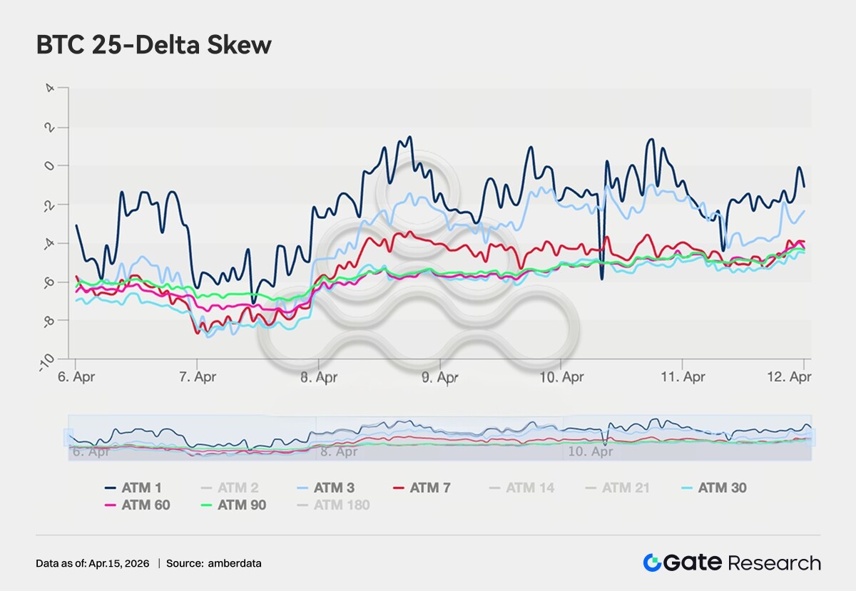 BTC 25-Delta Skew 全期限维持在 -4 至 -8 vol 区间,Put 溢价仍然主导,市场整体仍保持对下行风险的对冲需求。但相较 3 月底 -8 至 -11 vol 的极端区间,Skew 已明显抬升约 2–3 个 vol point,反映看空情绪边际缓和。ETH Skew 变化更为显著,由此前的 -5 至 -8 vol 区间整体上移至 -3 至 +2 vol,部分期限甚至接近对称,说明市场对尾部下跌风险的定价明显收缩。不过,长端 Skew 仍未明显转正,机构层面尚未完全转向进攻,整体维持降低防御但不彻底解除的配置状态。