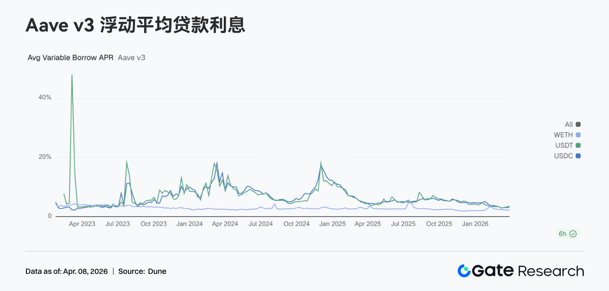 Aave 三大核心资产利率上周进一步分化。USDC 借款 APR 从 3.23% 升至 3.51%,上行最为明显;USDT 小幅升至 3.10%;WETH 基本维持在 2.23% 附近。在借贷规模回升的同时,资金主要流向稳定币贷款端,ETH 贷款需求未同步增强。市场行为更偏向资金调度、套利与仓位滚动,而非方向性杠杆扩张。在 V4 架构预期下,不同资产之间的资金价格分化可能进一步扩大。上周 USDC 利率的上行,已提前反映这一趋势。