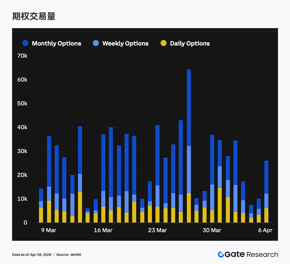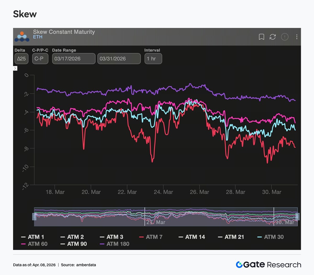 上周 Skew 整体仍处负值区间(约 -6 至 -10),结构上呈现短端下探和长端稳定的形态。3 月底至 4 月初,7D/30D Skew 一度快速下行至约 -12,随后虽有修复,但始终未回到中性以上,当前维持在 -7~-8 区间,短期保护需求明显回升。与此同时,长端 Skew 变化较小,整体更平稳,市场并未对中长期方向形成一致性悲观预期。当前市场主要在为短期不确定性定价,短端 Put 持续被买入,对应事件驱动或到期节点前的风险对冲。