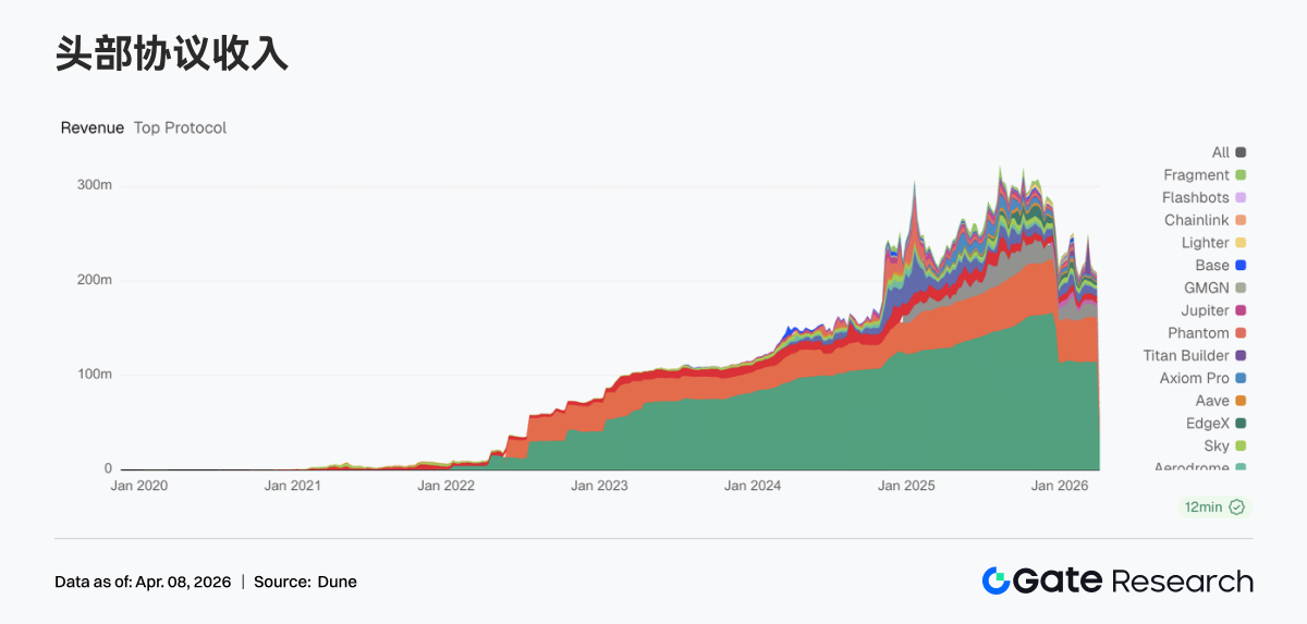 • 协议收入结构回归常态。稳定币发行端仍为主要收入来源;交易平台收入较前一周回落,而钱包与前端入口,如 Pump、Phantom、Jupiter 收入上升,资金向流量分发环节回流。