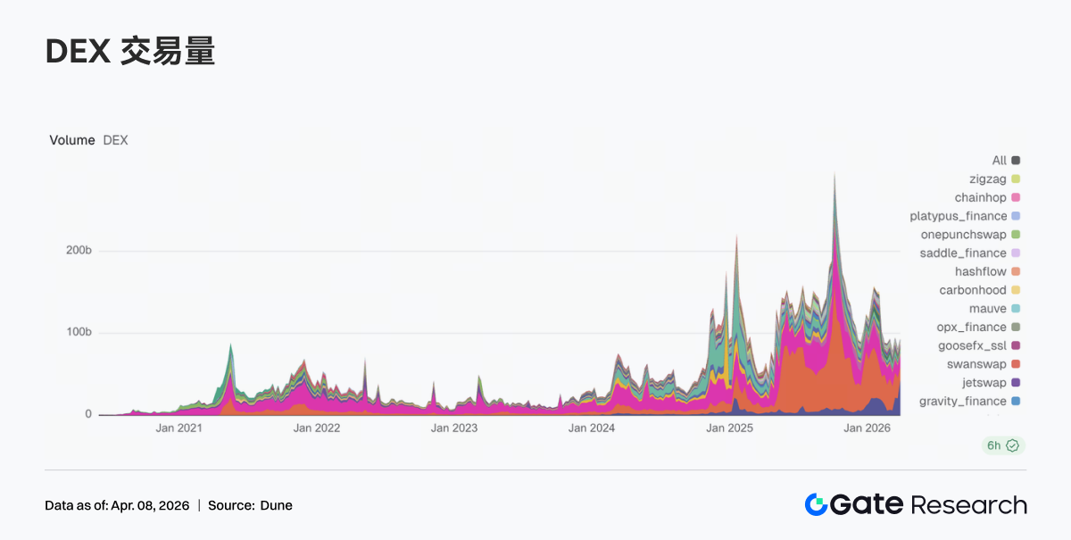 • 链上与交易结构向高波动资产集中。Perp DEX 与 CEX 的 TradFi 交易量明显向原油与贵金属倾斜,能源类占比显著抬升,贵金属维持高位;DEX 结构发生重排,Meteora 交易量大幅增长并跃居首位,流动性向少数高效率协议集中,Solana 生态内部出现分化。