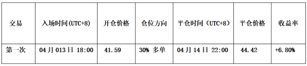 • 开仓策略:首先基于对市场Ⅴ浪上涨趋势判断;其次价差交易模型已提前发出底部预警信号(图中好点);再次动能模型中的两条动能线同步运行至零轴上方,并且两大模型发出共振上涨信号。,我们于 41.59 美元建立了 30%多头仓位。