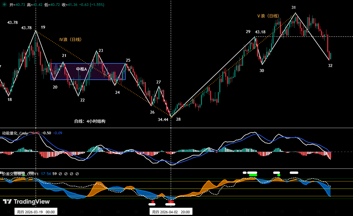 • 若跌破此支撑位,且随后的反弹高点无法超越 45.76 美元(即端点 31),则构成“调整破前低,但后续反弹不创新高”的经典技术形态。这将意味着自 4 月 2 日低点启动的日线级别Ⅴ浪上升结构,有很大概率已于 45.76 美元完成终结。