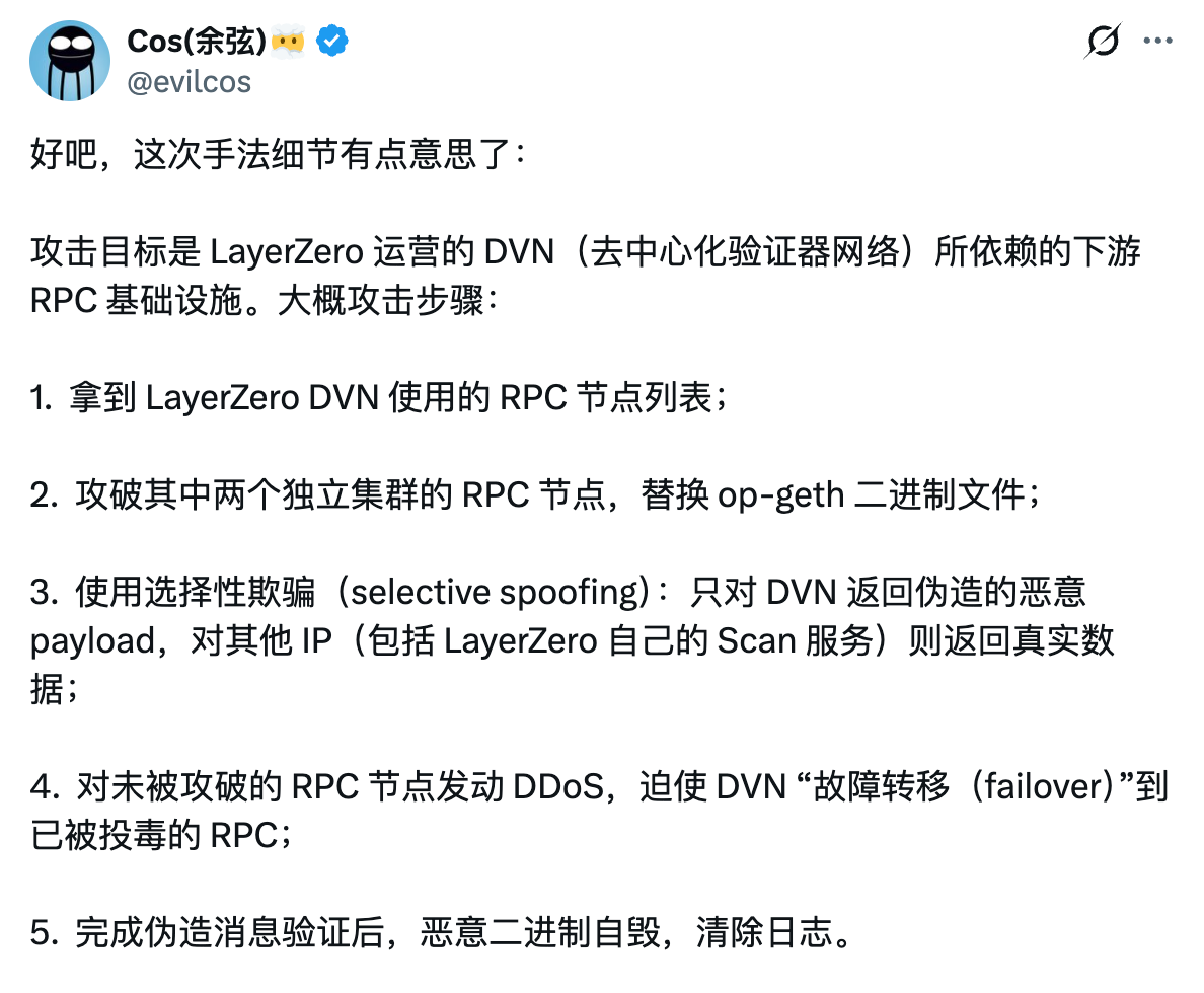 根据 LayerZero 方面的细节披露,事件发生的直接原因已相当清晰,即 LayerZero 运营的去中心化验证器网络(DVN)所依赖的下游 RPC 基础设施被攻破(参见下图慢雾创始人余弦的分析),且由于 Kelp DAO 的桥接合约采用了 1/1 的 DVN,攻击者只需完成一笔伪造的消息验证,就足以完成攻击。