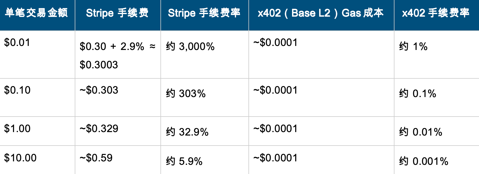 资料来源:Stripe 官网标准费率;Base L2 链上 Gas 费量级参考链上浏览器公开数据。