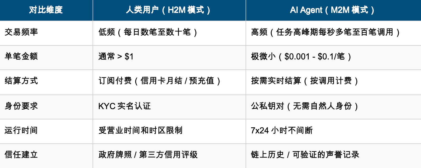 更深层的错配在于支付颗粒度。传统卡组织的定价逻辑(以 Stripe 为例,标准费率 2.9% + $0.30/笔)是为人类消费场景设计的——假设单笔金额足够大、频次足够低。但 Agent 的典型行为恰恰相反:高频、微额、按调用计费。一笔 $0.001 的 API 调用,在信用卡体系下连固定手续费都无法覆盖。