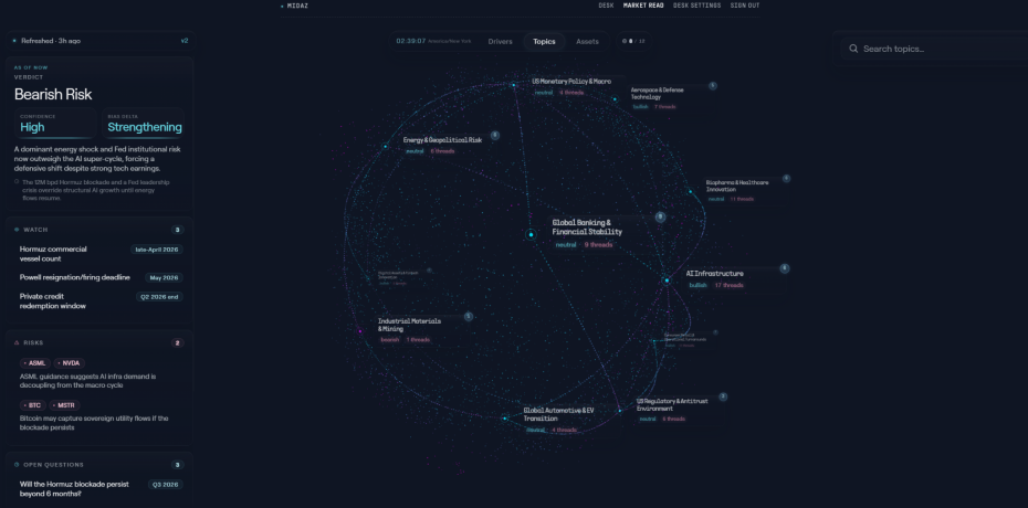 Midaz(midaz.xyz)是当前这一方向上最具代表性的实践。其核心理念可以用一句话概括:Built for Agents, Visualized for Humans。作为 2025 年币安黑客松的获奖队伍,Midaz 的核心团队成员来自 Millennium、Citadel 等华尔街顶级量化基金,将市场信息重构为三个结构化层次:Assets 层对应具体交易标的,Topics 层将围绕资产的事件与信号聚合为带有方向性判断的市场主题,Drivers 层则进一步抽象出驱动这些主题演变的因果力量——例如美国滞胀与消费信贷周期断裂、AI 基础设施扩张与定制芯片采用等。