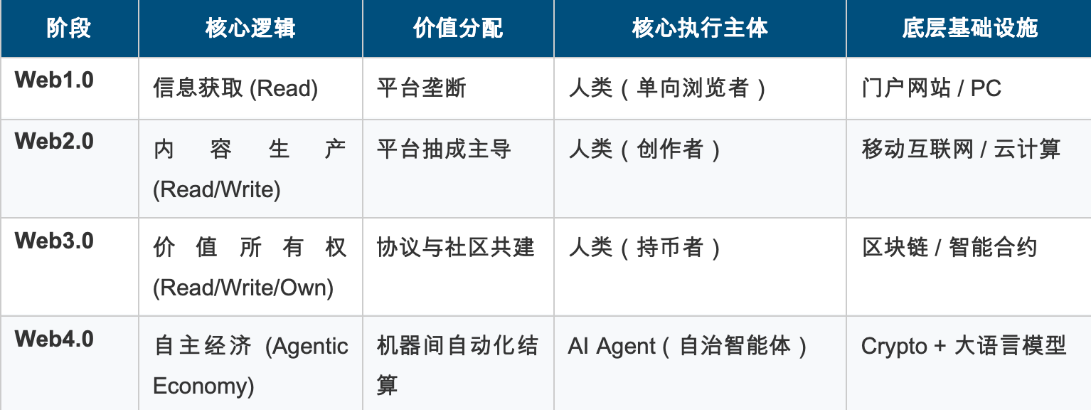Web4.0 的本质是一次执行主体的迁移——从人类操作互联网,到 AI Agent 自主参与经济。这不是一个渐进式的产品迭代,而是底层逻辑的系统性重构:当网络的核心参与者从自然人变为机器,整个协议栈都需要重新适配。
