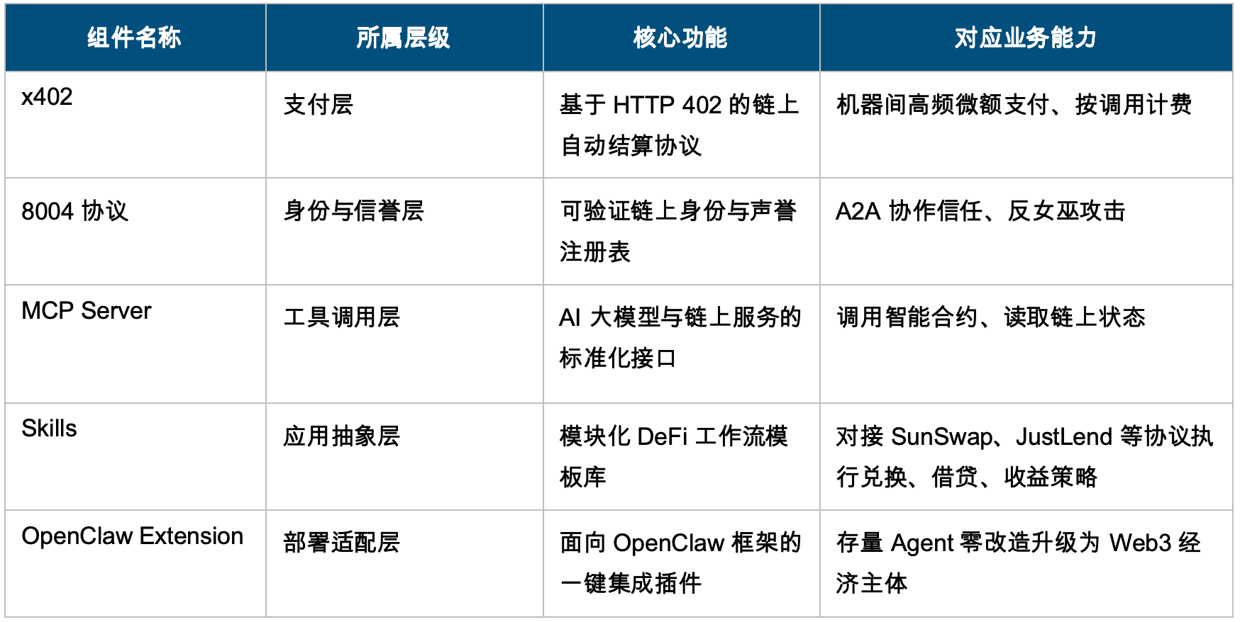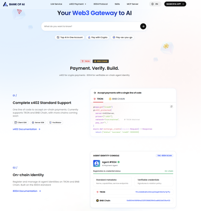支付层是 Agent 从信息处理工具跃迁为真正经济主体的关键一环。前文已经阐述 x402 协议的技术原理与治理架构,本节聚焦其在 TRON 生态中的典型落地案例——Bank of AI(https://bankofai.io/),它是 AI Agent 时代基础金融设施 白 B.AI(https://b.ai/)产品的重要组成模块。这一案例之所以具有代表性,在于它并未停留在协议层的抽象讨论,而是首次将 x402、ERC-8004、MCP Server、Skills 以及 OpenClaw 扩展五大核心组件打包成完整的 Agent 金融操作系统,使 Agent 在真实链上环境中具备了端到端的业务执行能力。