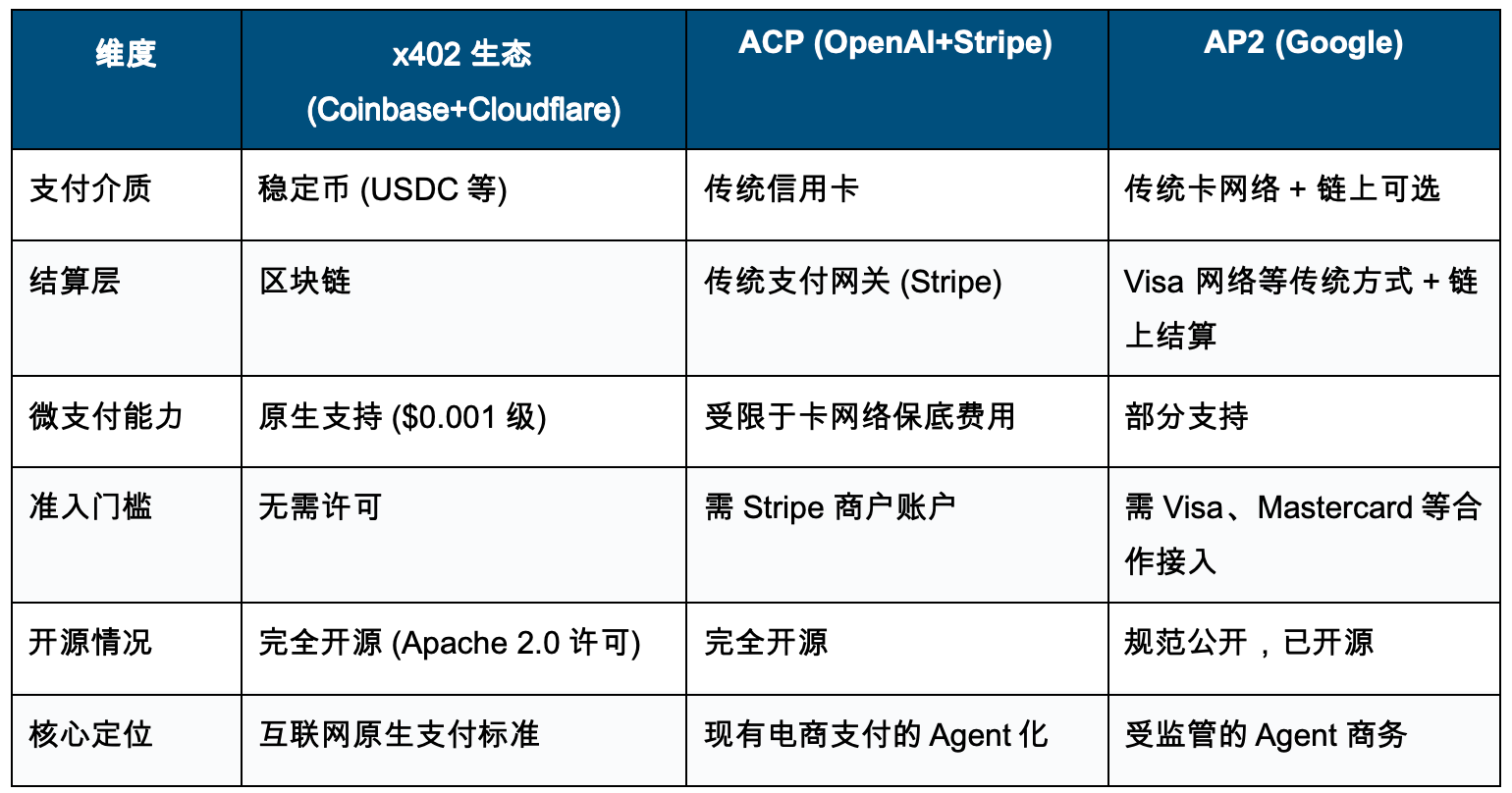但值得指出的一点是,x402 并非 Agent 支付领域的唯一方案。OpenAI 与 Stripe 合作推出了 ACP(Agentic Commerce Protocol),Google 主导开发了 AP2(Agent Payments Protocol)。与 x402 生态协议相比,代表了截然不同的技术路径和商业理念。