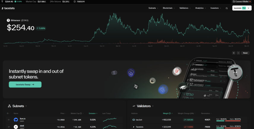Bittensor 是目前去中心化 AI 算力赛道中规模最大的项目之一,是基于 Substrate 框架(与 Polkadot 同源)构建的 Layer1,有自己的共识机制、验证者节点网络、原生代币 TAO。Bittensor 把区块链的激励机制用于 AI 模型生产本身——矿工在链上竞争贡献有价值的 AI 推理和模型训练,TAO 按贡献质量分配奖励,由此形成一个无需许可的去中心化 AI 模型市场,Agent 可以从中调用各类 AI 能力,而不必依赖 OpenAI 或 Anthropic 这样的中心化服务商。