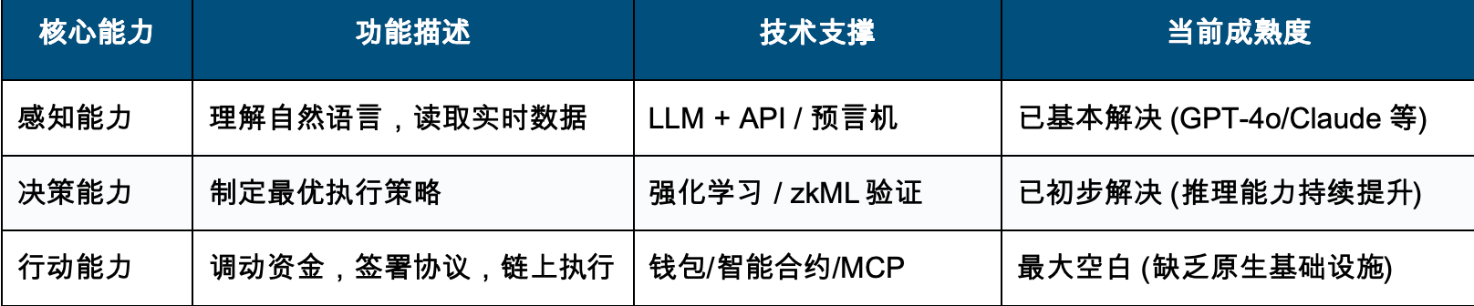一个能够真正参与经济循环的 AI Agent 必须同时具备三项核心能力:感知、决策和行动。感知能力和决策能力已随着近两年大模型技术的快速发展得到初步解决,但行动能力却是当前最大的基础设施空白——现有金融体系严格基于自然人或法人身份构建,AI Agent 无法在商业银行开立账户或合法申请信用卡,这直接导致 AI 只能停留在信息层运行。