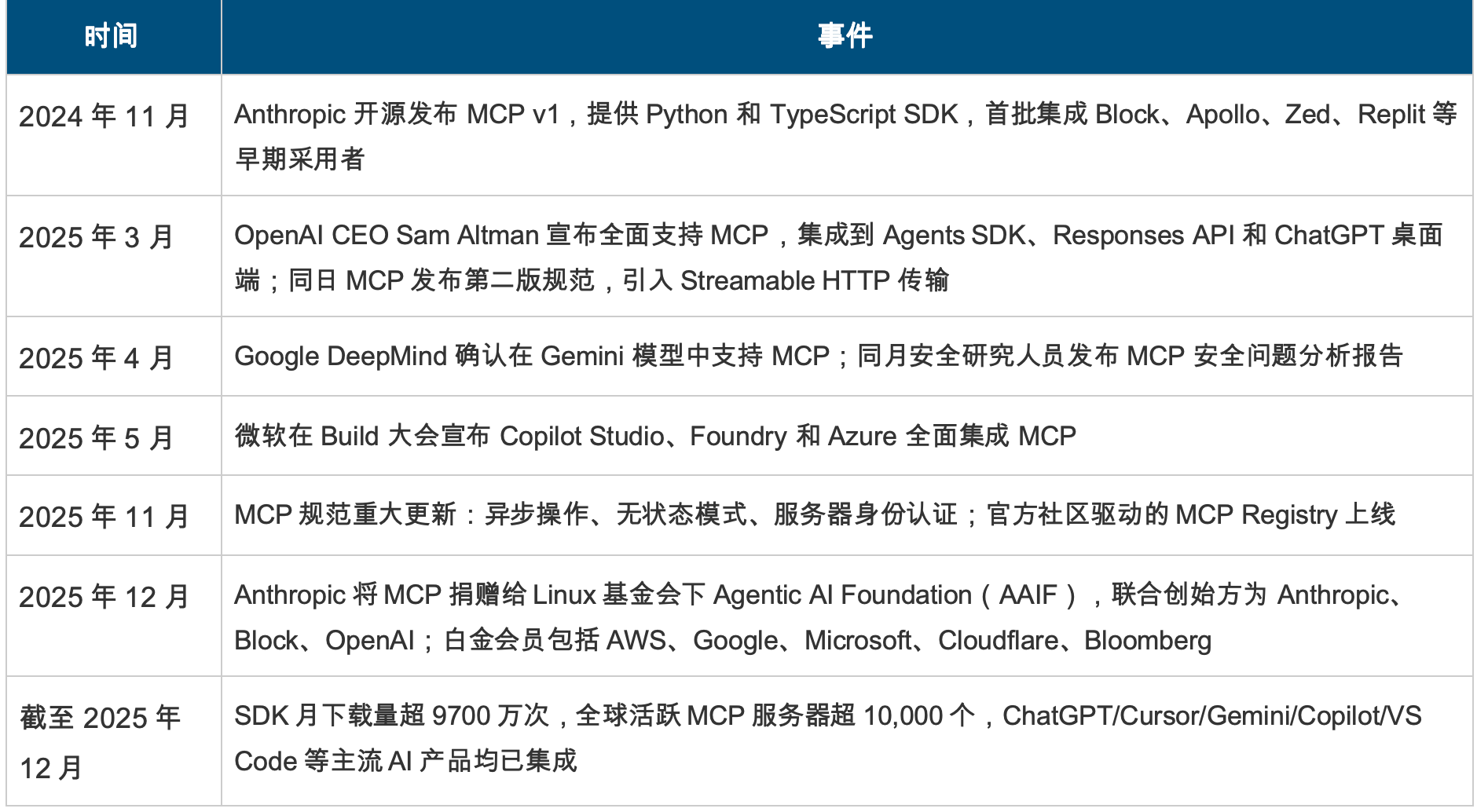 数据来源:Anthropic 官方博客及 AAIF 公告(2025 年 12 月);Wikipedia MCP 词条(2026 年)