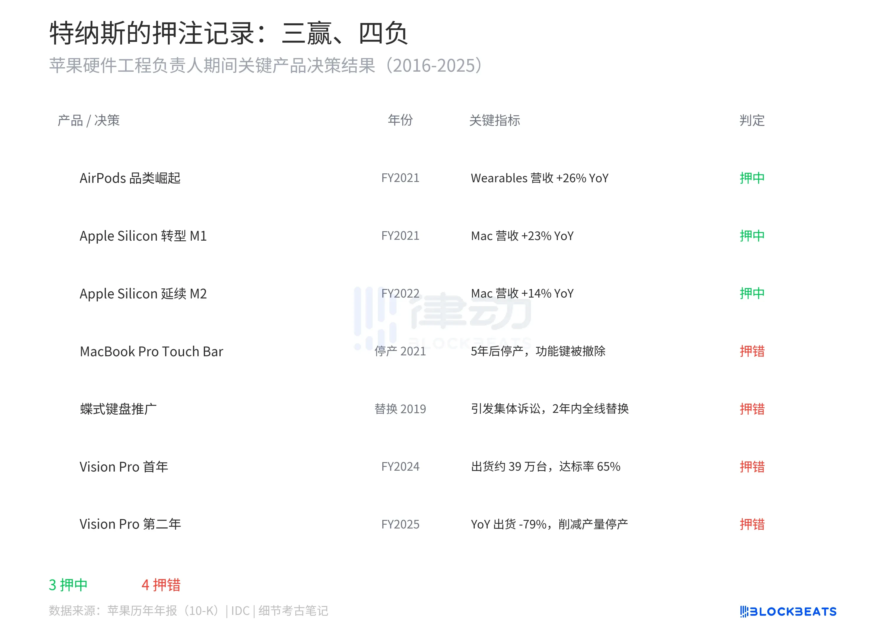 这份成绩单里有一条规律:他押对的,是在成熟品类里押入一项决定性技术(M1 之于 Mac,AirPods 之于无线音频)。他押错的,是试图用硬件定义一个全新的计算范式。Touch Bar 想重新定义键盘交互,失败了。Vision Pro 想定义空间计算,失败了。