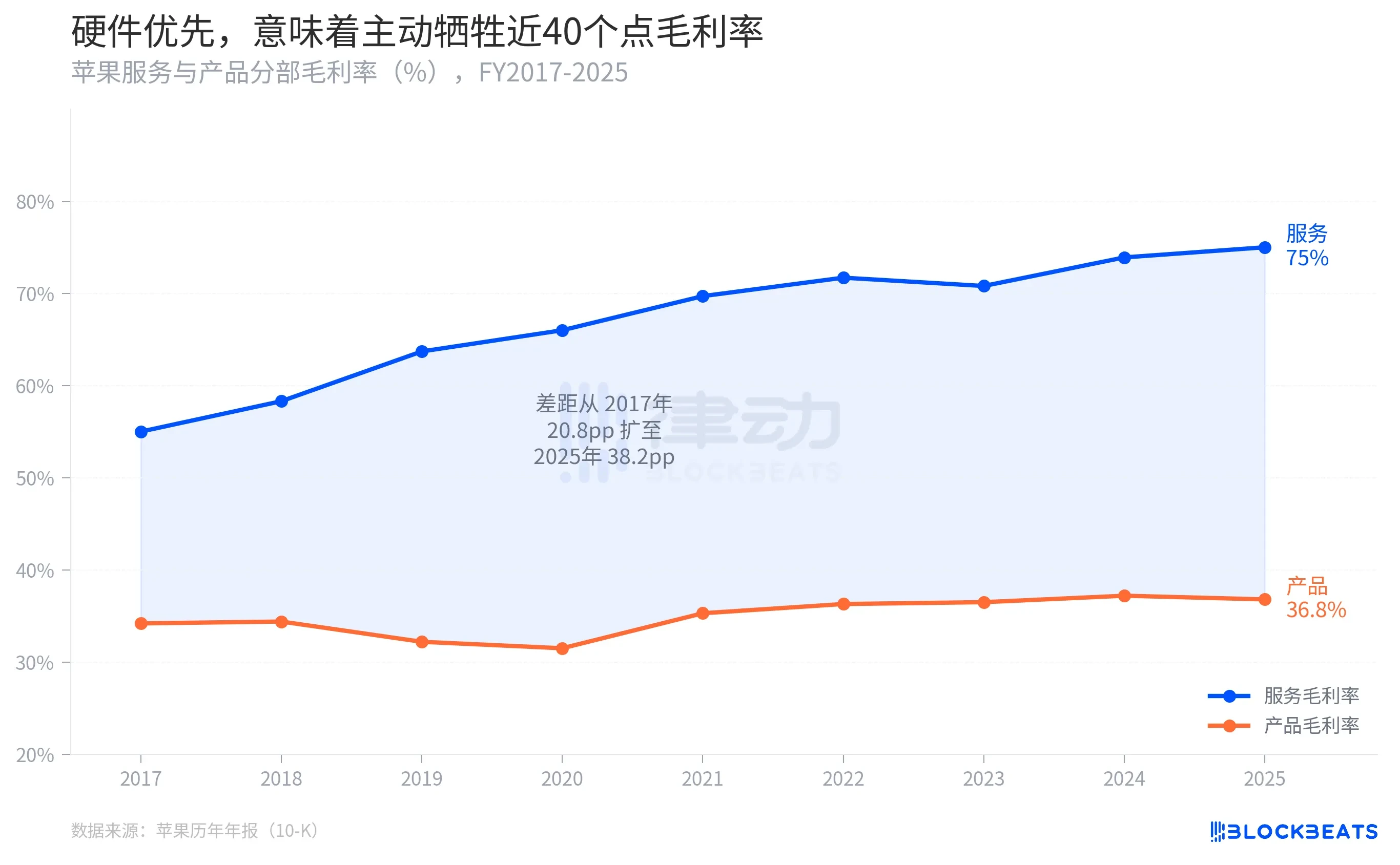 这个重塑,有一条清晰的数字注脚。据苹果历年年报,2017 年苹果服务板块的毛利率约 55%,产品板块约 34.2%,差距 20.8 个百分点。到 2025 财年,服务毛利率升至 75%,产品毛利率基本原地踏步,维持在 36.8%,差距扩至 38.2 个百分点。苹果每从产品转一块钱到服务,毛利贡献就多出约 38 美分。