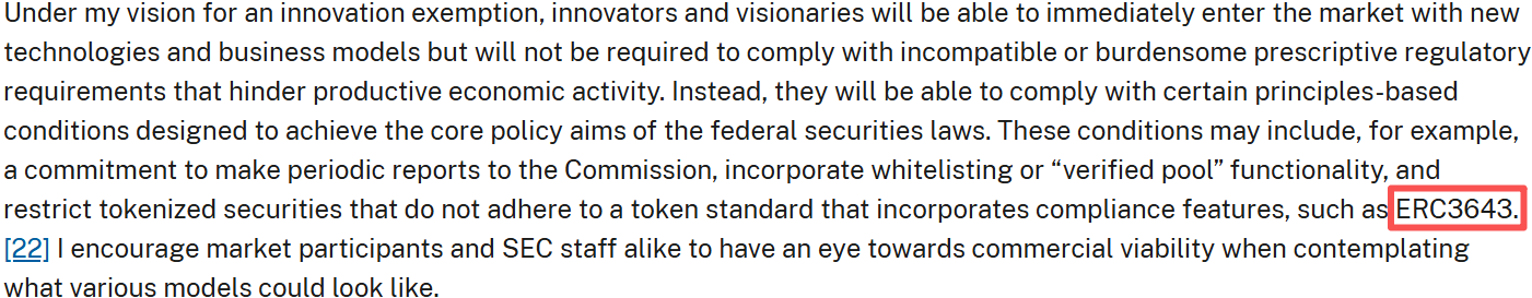 2025 年 7 月 31 日,SEC 主席 Paul Atkins 以“美国在数字金融革命中的领导地位”为题举行演讲,并宣布启动“Project Crypto”计划。其中,ERC-3643 被明确提及,成为全场演讲中被唯一公开引用的标准。Paul Atkins 表示,当 SEC 搭建创新豁免框架时,将优先考虑“内置合规”的代币标准。ERC-3643 则集成了身份验证、权限控制与交易限制等功能,可直接满足《证券法》对 KYC/AML 及合格投资者的要求。