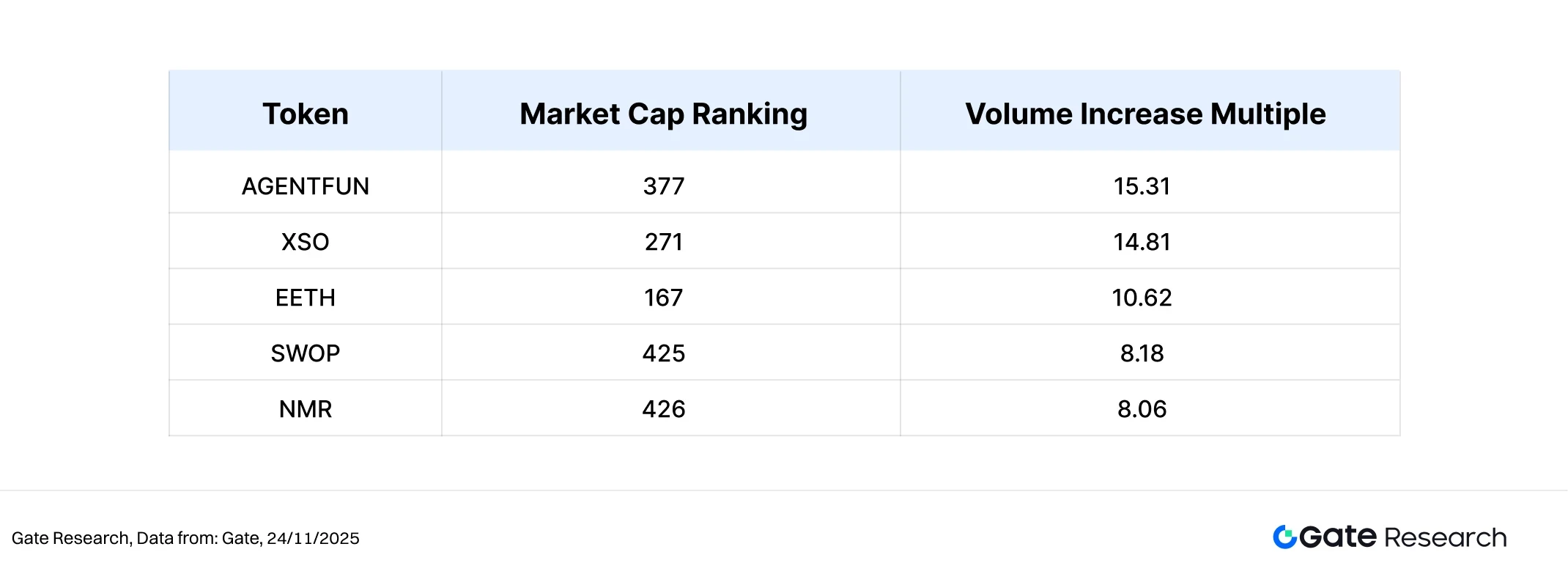 图五:AGENTFUN、XSO、EETH 等代币本期成交量显著放大,但多数并未形成趋势性反弹,呈现量价背离结构,凸显市场资金更偏短线与流动性导向