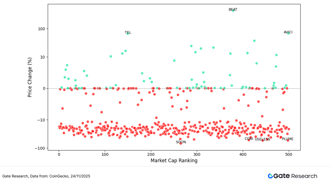 为观察本轮行情中代币表现的结构特征,本文绘制了市值前 500 名代币的散点分布图。横轴为市值排名(越靠左市值越大),纵轴为 11 月 11 日至 11 月 24 日期间的价格涨跌幅。图中每个圆点代表一个代币,其中绿色代表上涨、红色代表下跌。