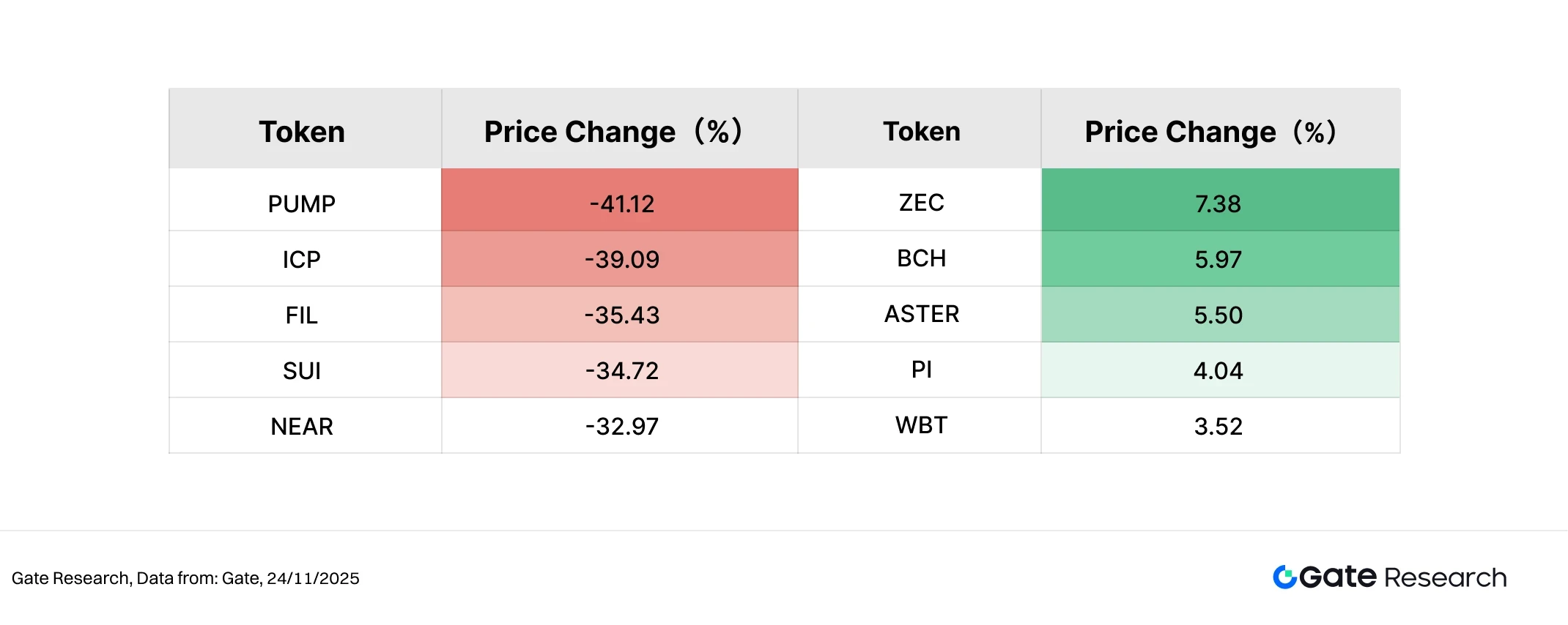 过去两周(11 月 11 日至 11 月 24 日),加密市场在宏观压力与叙事轮动的交织下出现显著分化,个别代币涨跌幅度剧烈,凸显市场情绪仍处于高波动区间。