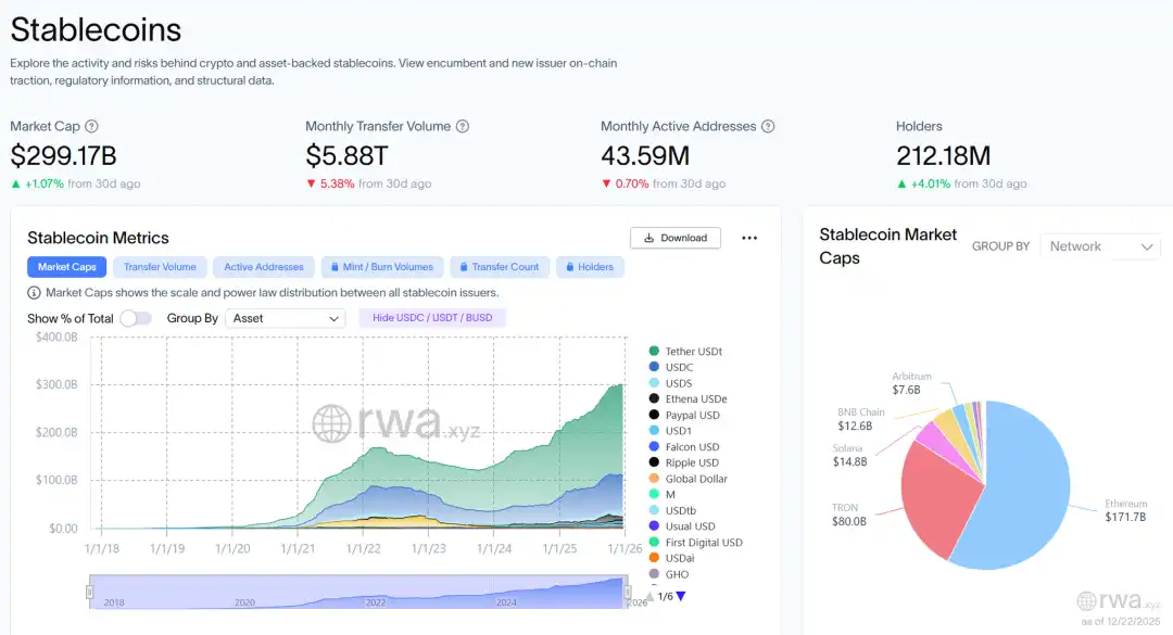 全年最直接的信号是链上美元基底的实质加厚:稳定币总供给由约 2050 亿美元扩张至 3000 亿美元以上,且高度集中于头部(年末附近 USDT 约 1867 亿美元、USDC 约 770 亿美元);发行方合计持有约 1550 亿美元美国国库券,使稳定币更接近「代币化现金 + 短久期国债」的基础设施组合。使用侧同样强化:稳定币占据约 30% 的链上加密交易量,年内链上活动累计超 4 万亿美元,支付型链上交易规模被估算在 200–300 亿美元/日量级,跨境结算与资金调拨的真实需求持续抬升。