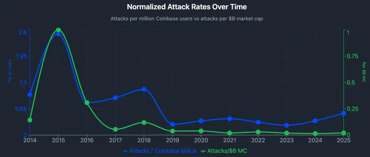 从 2015 年到 2025 年,Coinbase 的月活用户数量从 200 万增长到 1.2 亿,这是整整 60 倍的增长,但暴力事件并没有按比例同步增长。