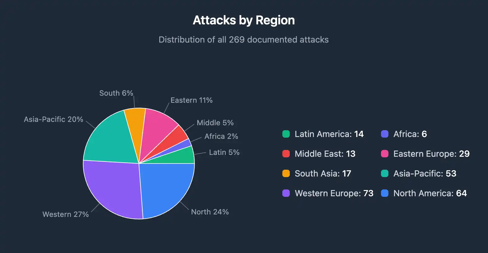 从地理分布来看,西欧和亚太地区的暴力事件增幅最大。北美目前仍然是相对最安全的地区,但即便是北美,绝对数量上也出现了上升趋势。