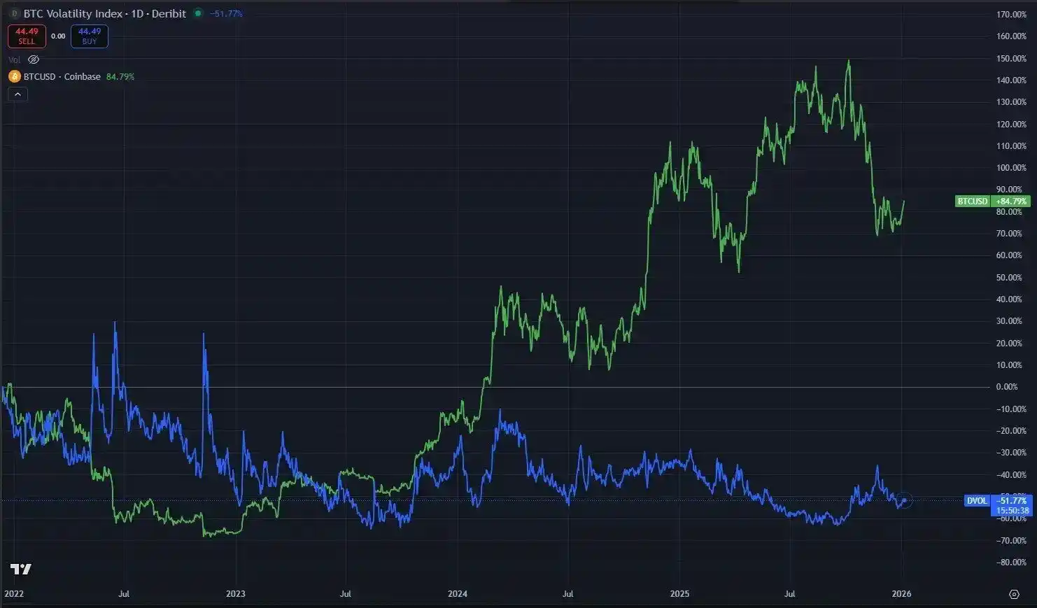 同时,BTC 波动率与价格形成背离,尤其在 2025 年 8 月 BTC 首破 12 万美元时,Deribit DVOL 却处于阶段低位,隐含波动率并未对新高给予溢价,表明期权市场对趋势延续的定价趋于谨慎。