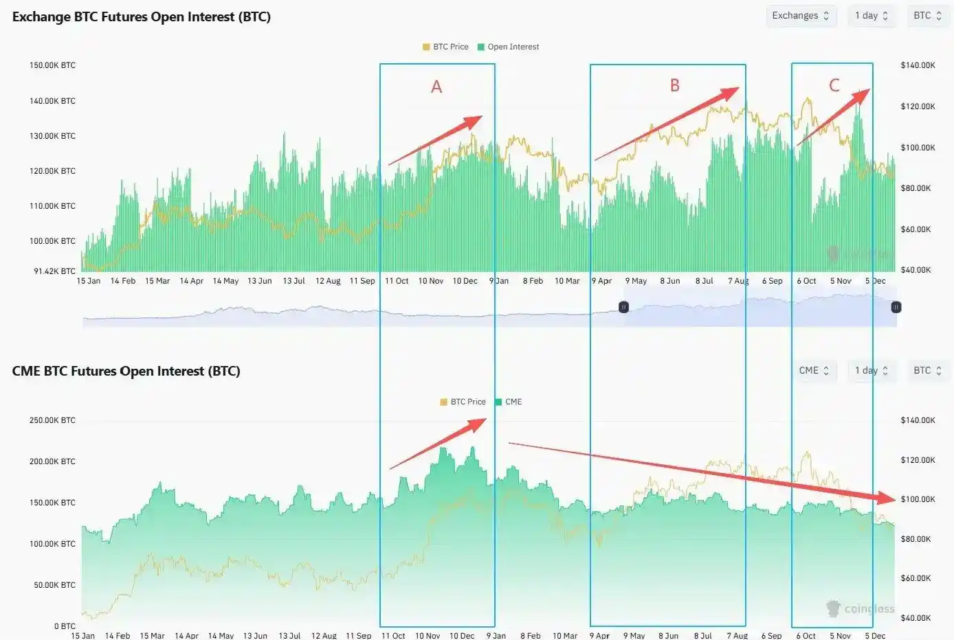 以 BTC 计价的 offshore OI(以 Binance BTC OI 为例)在 B、C 两个阶段持续走高,杠杆率上升,即便 10·10 杀杠杆后短线回落,随后也很快恢复到高位,甚至创下新高。相对而言,以 CME 为代表的 onshore 期货 OI 从 2025 年初开始便持续下行,在价格创出新高时并未同步回升;