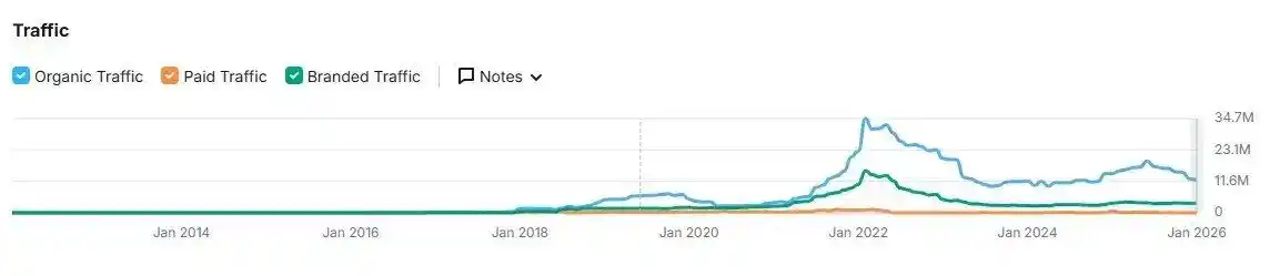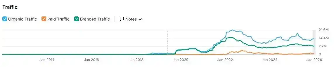 从 Binance、Coinbase 等几家头部 CEX 的站点流量可以看到:自 2021 年牛市峰值以来,整体访问量持续下行,即便 BTC 创出新高也未显著恢复,与隔壁 Robinhood 的火爆形成鲜明对比,更多可以阅读我们去年写的「Where are the marginal buyers」「边缘买家在哪里」。