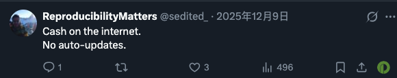 当然,真正的技术极客或许都会有些难以琢磨。TheCharlatan在X平台经常转发其他技术性推文,却极少表达自己的观点(2025年5月其发文称更加讨厌NFT),但自2025年6月开始,每个月他都会重复发一条内容为“Cash on the internet. No auto-updates.”的推文。