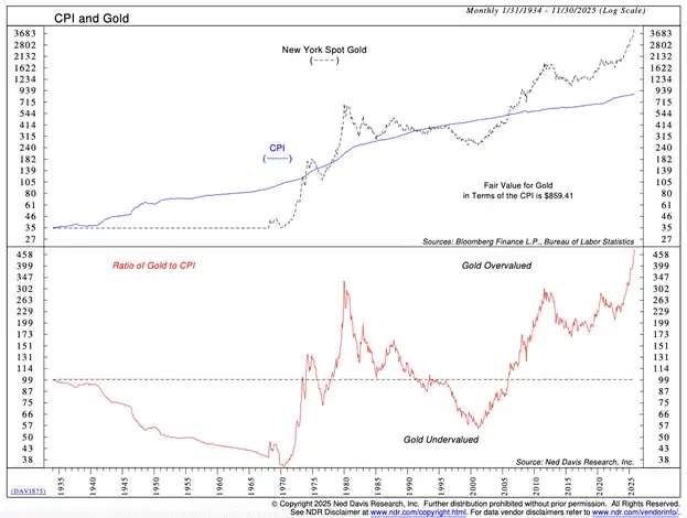 在法币系统中,黄金的传统观点是抗通胀工具。因此,它应该大致跟踪帝国操纵的 CPI 指数。上图显示,自 20 世纪 30 年代以来,黄金大致跟踪了该指数。然而,自 2008 年起并在 2022 年后加速,金价的上涨速度远超通胀。那么,黄金是否存在泡沫,准备收割我这样的赌徒?