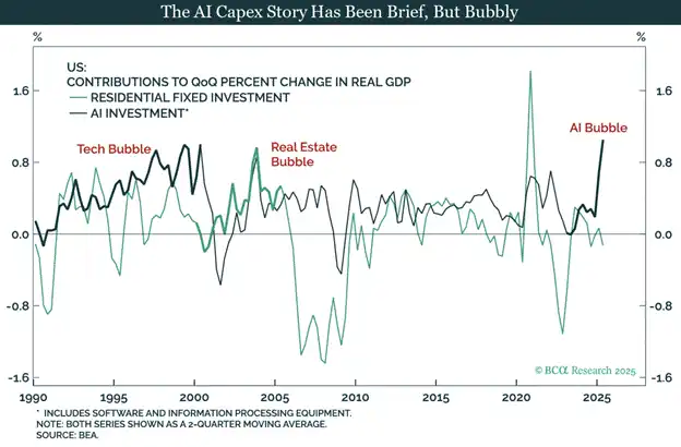 无论是否有泡沫,为了「赢得」AI 而增加支出正在驱动美国经济。特朗普承诺让经济运行得火热,他不能仅仅因为几年后这些支出的回报率可能低于资本成本就停下来。