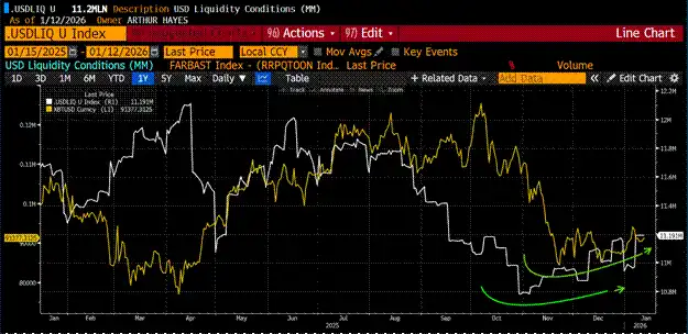 如果 2025 年比特币、黄金和股市的价格走势验证了我的市场架构,那么我可以继续关注美元流动性的起伏。