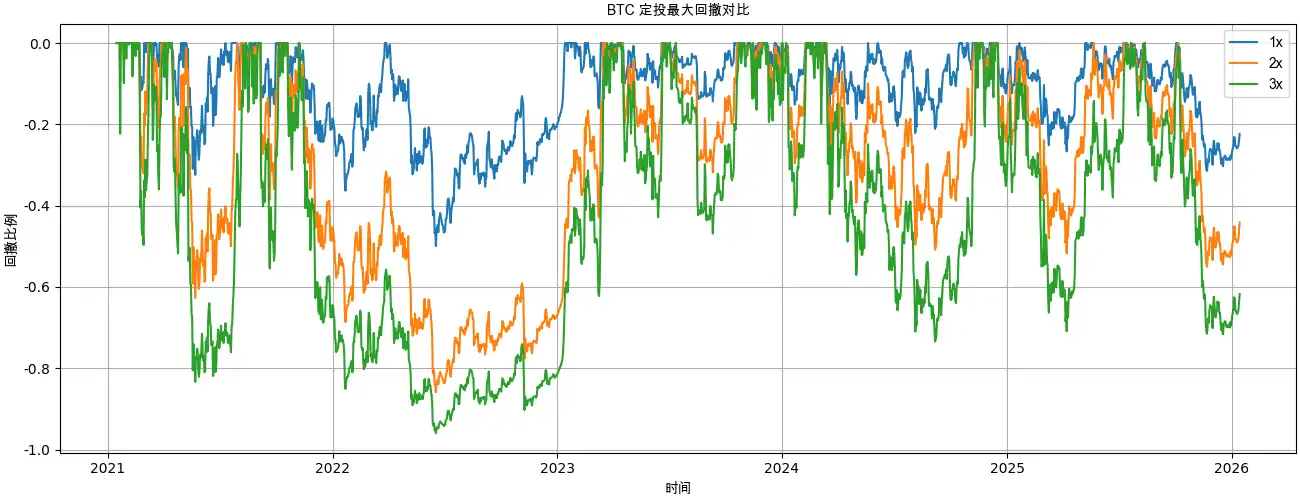 在过去五年的回测中,BTC 三倍杠杆定投的最终收益只比两倍杠杆多 3.5%,却付出了接近归零的风险代价。