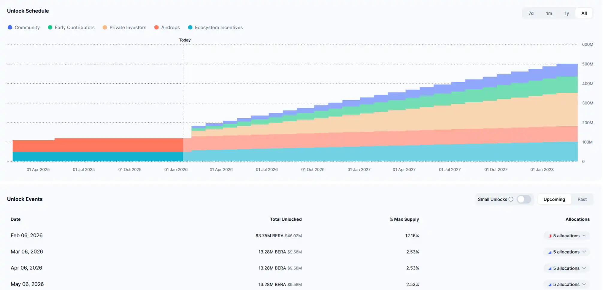今年 2 月 6 日,Berachain 将解锁 6375 万枚 BERA,约占当前流通的 12.16%,这其中私募投资者就有 2858 万枚解锁。从今年 3 月起,BERA 每个月解锁的份额是总供应量的 2.53%。考虑到当前流动性枯竭,今年持续大额解锁或许会引发大量抛压。