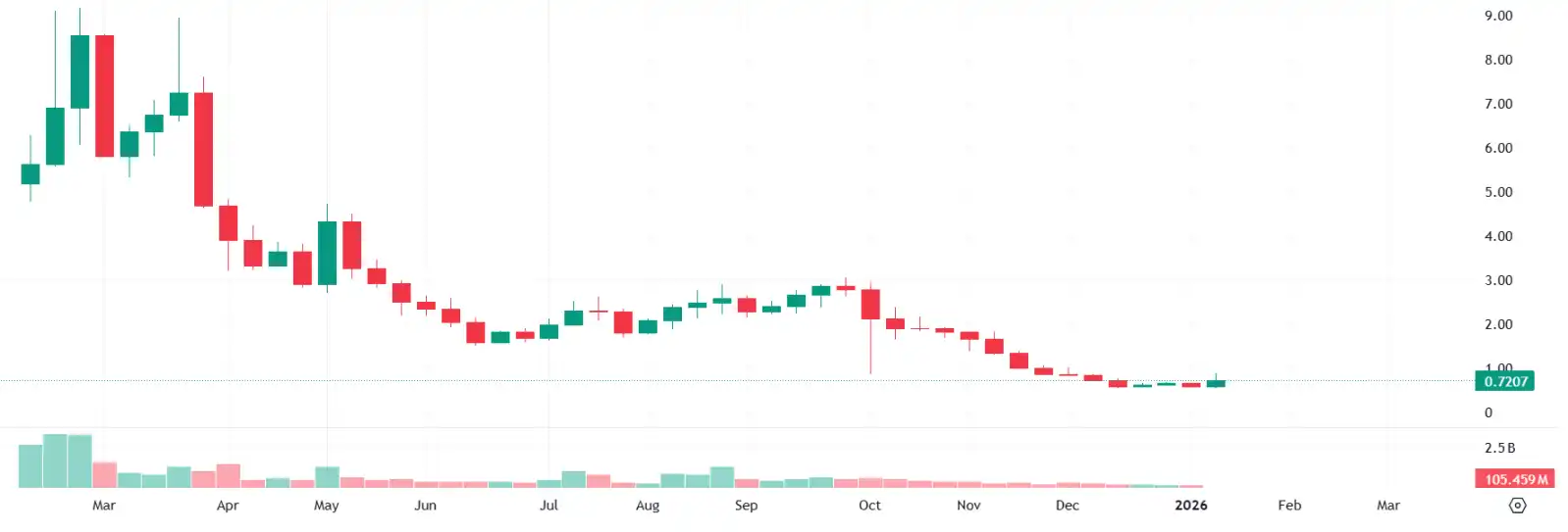 BERA 币价自 9 美元高点后一路下跌至如今的 0.7 美元,短短一年时间,曾经的所谓天王公链代币跌幅超 10 倍。