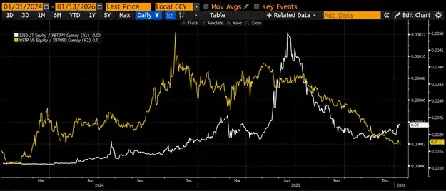 [图表:MSTR 和 Metaplanet 相对于比特币的价格比率]