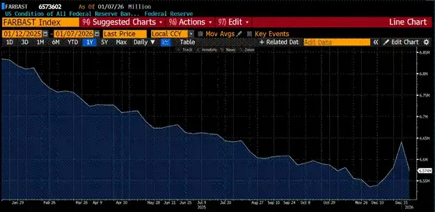 美联储的资产负债表在 2025 年因量化紧缩(QT)而下降。QT 在 12 月结束,并在当月会议上启动了名为「准备金管理购买」(RMP)的新印钞计划。我在之前的文章中深入讨论过。图表清晰显示,资产负债表在 12 月触底。RMP 每月至少注入 400 亿美元,随着资助美国政府所需的资金增加,其规模还会扩大。