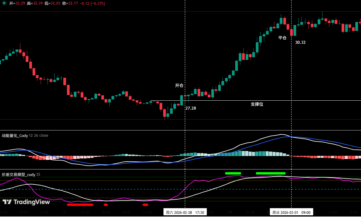 • 平仓决策:价差量化模型与动能量化模型发出顶部共振信号,所以在 30.32 美元附近平仓。