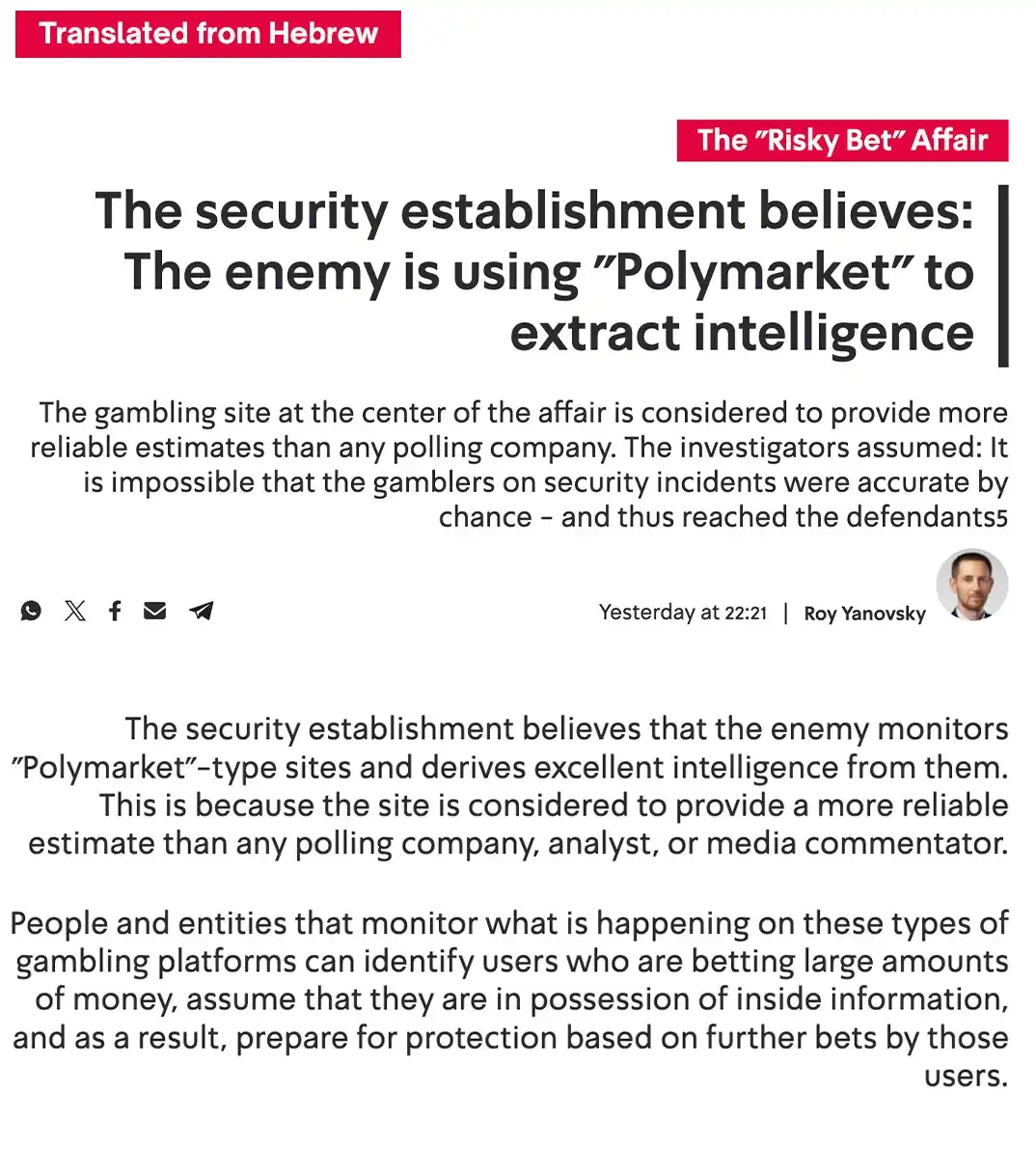 在 ricosuave666 被捕当天,以色列公共广播机构 Kan News 犯罪事务部门负责人、记者罗伊·亚诺夫斯基在以色列第 12 频道新闻中表示:「以色列的敌人正在将预测市场 Polymarket 作为重要的军事情报来源。」