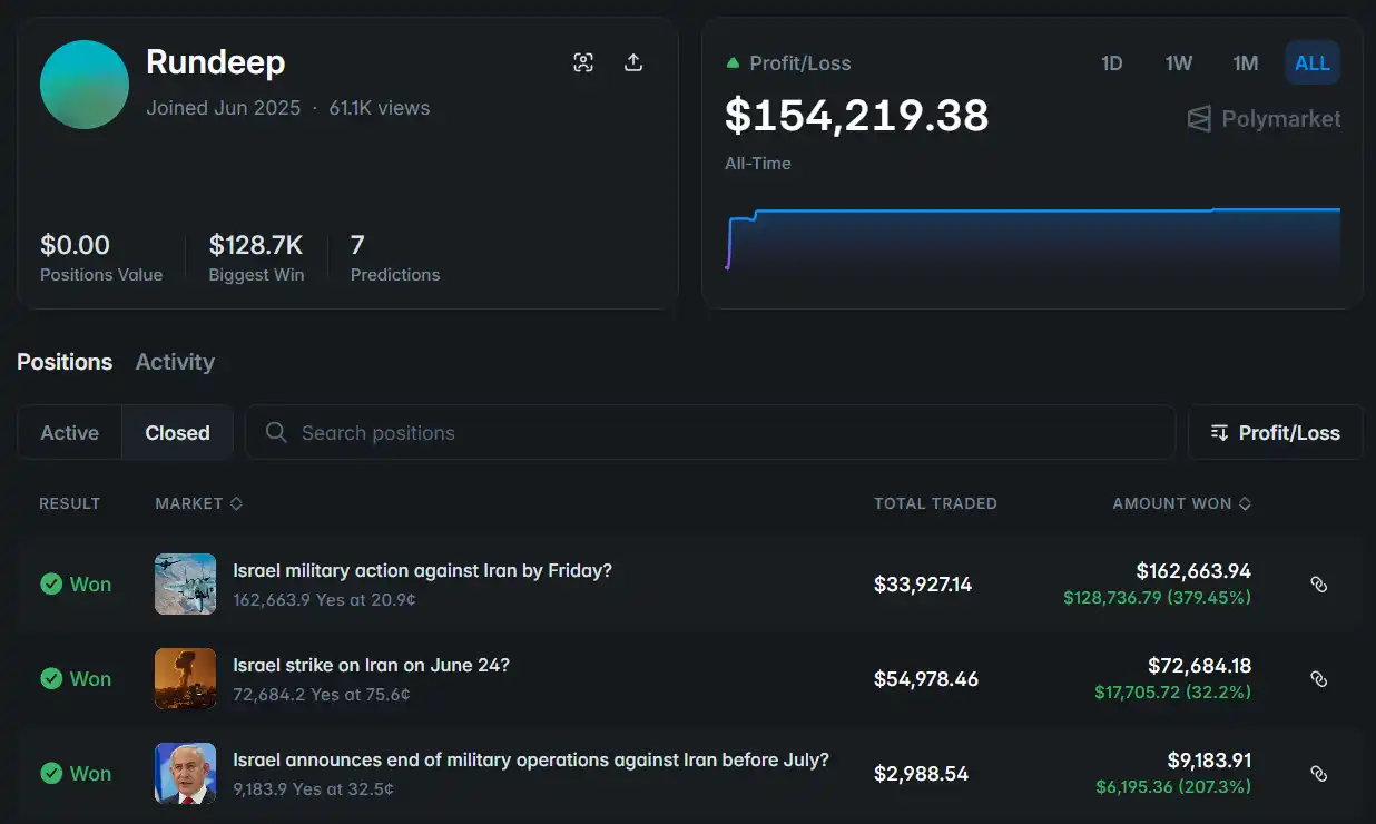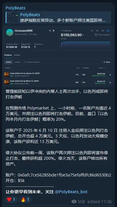 2025 年 6 月中旬,以色列对伊朗实施打击期间,一个名为 ricosuave666 的账户精准押中打击与和谈时间,获利 15 万美元。获利并取现后,该账户随后长时间沉寂,直到 2026 年 1 月 6 日再次活跃,并押注以色列将对伊朗发动打击。