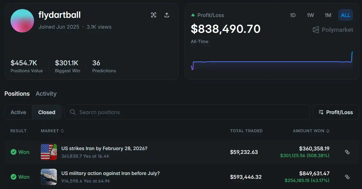 其中两个账户均为 2 月新注册,除押注伊朗相关事件外,没有任何其他交易记录——几乎像是为这一事件而生:押注打击,等待打击发生,随后获利离场。