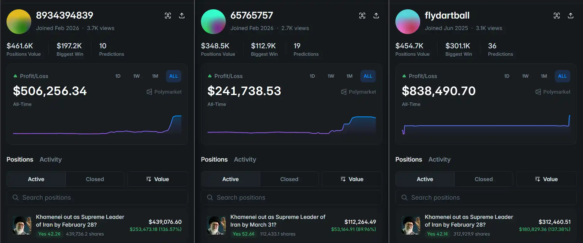 最终结果已众所周知:哈梅内伊在空袭中遇害。三个账户围绕伊朗打击相关事件累计获利约 160 万美元。监控频道 PolyBeats 对三人自 2 月以来的押注行为进行了持续跟踪播报,每一次建仓都发生在事件落地之前,将战事进程提前呈现在公众面前。