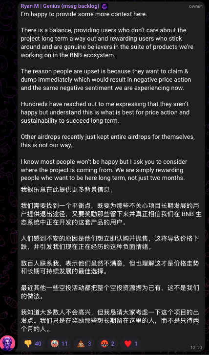根据官方 Telegram 最新信息,Genius 解释此空投分配方案是既要为那些不关心项目长期发展的用户提供退出途径,又要奖励那些留下来并真正相信这套产品的用户。
