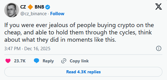 更有趣的是,官方文档中空投部分配上了 CZ 此前的一条推文(推文内容:“如果你曾经嫉妒那些低价买入加密货币并能熬过周期的人,想想他们在这样的时刻做了什么。”)