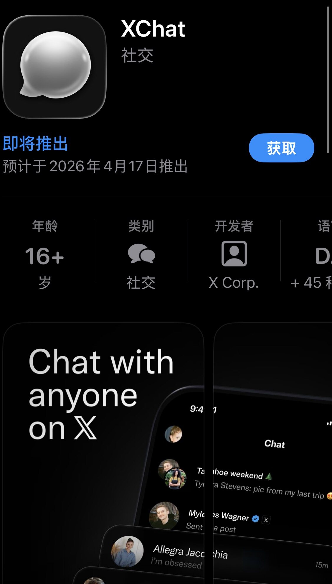 4 月 11 日,马斯克旗下 X 平台正式宣布,独立加密通讯应用 XChat 将于 4 月 17 日登陆苹果 App Store,面向全球用户开放下载。