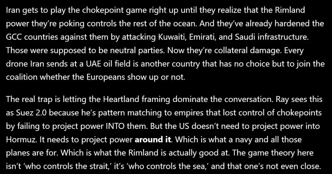 截图主要在说,伊朗试图用「卡住海峡」作为筹码,但这不仅在战略上误判了美国的优势(海洋控制而非节点控制),也在战术上不断把更多中立国家推向对立面。
