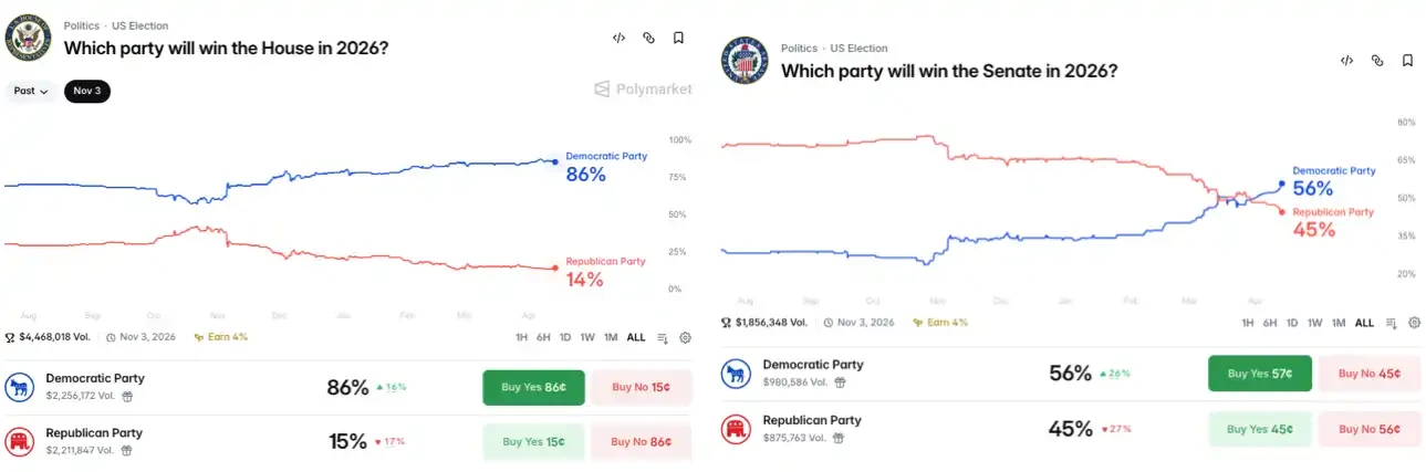 道理不复杂。降息压低借贷成本,刺激消费,推高股市,让普通人感觉到钱更好赚了。而这种感觉,会在选票上体现出来。年底有中期选举的现实压力,截至撰稿时间,Polymarket 数据显示中期选举,民主党赢下众议院的概率高达 86%,赢下参议院的概率从战前劣势的 36% 反转为优势方的 56%。